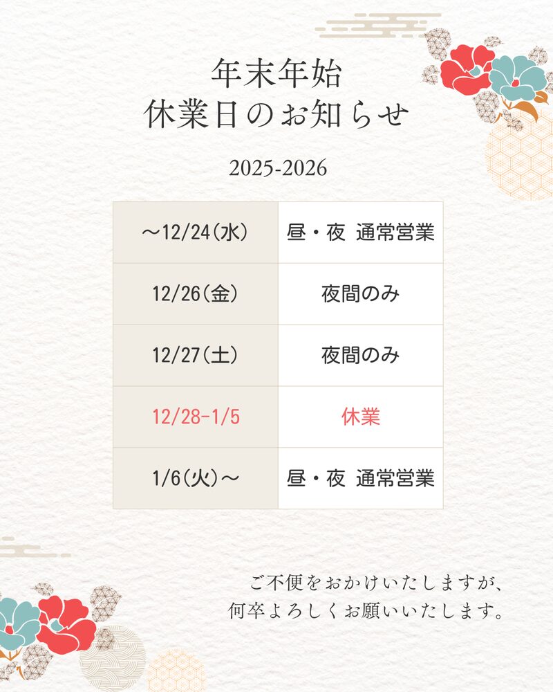 12月24日(水)まで、お昼も夜間も通常営業しております。